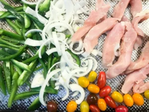 - Place chicken, onion, bell peppers, and cherry tomatoes on a large sheet pan (I use a half sheet).